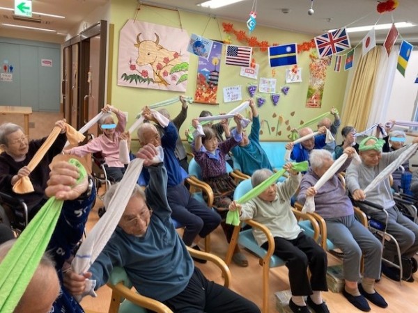 グループホームみんなの家・墨田でタオルを使った「AK体操」を楽しむ