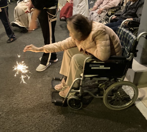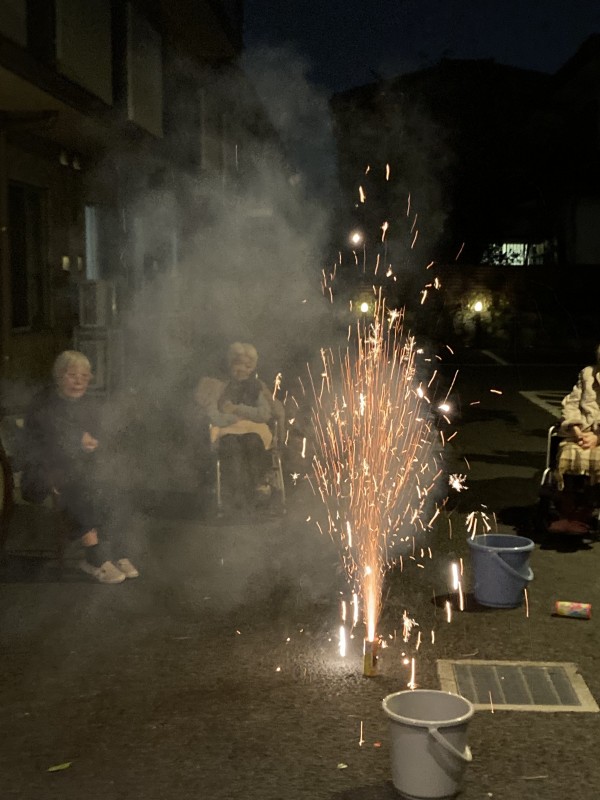 季節外れではありますが、11月に花火レクを開催しました。本来であれば真夏に開催したいレクリエーションですが、夏は日の入りが遅く、早くに休まれる方にはご参加いただく事が出来ません。なるべく多くの方にご参加いただくために季節外れではありますが、この時期に花火レクの開催となりました。(12月に花火レクを実施する案も出ましたが、12月では寒くなってしまうので、この時期の開催となりました。)
