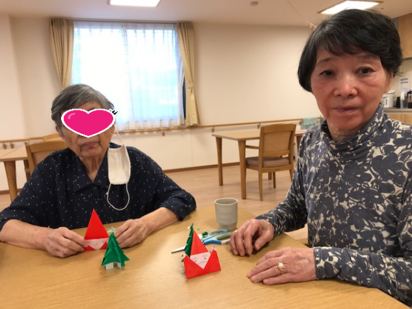 皆さんお元気にお過ごしでしょうか。今日は、ご利用者様と一緒に、折り紙の本を見ながらサンタクロース????ともみの木を作りました。クリスマスリースは看護師さんの手作りです!ご利用者様全員の表札の下に飾り付けてあります。