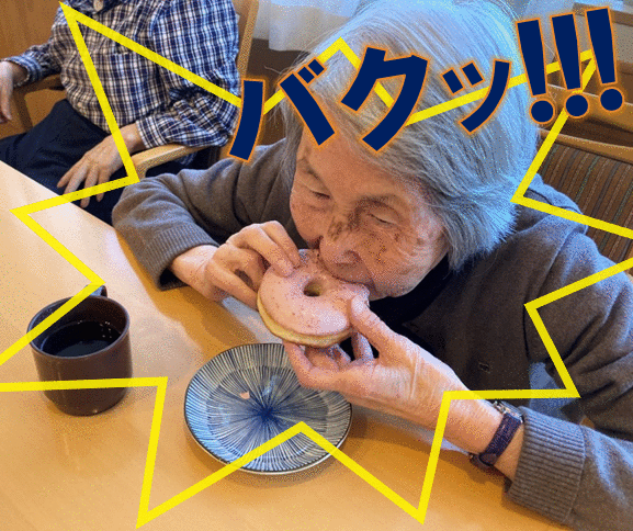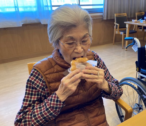 ホーム長「ドーナッツは手で持って大きな口でかぶりつくと美味しいですよ。バクッと」