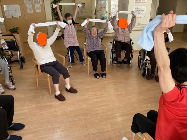 皆さん、タオルを持って、手を上げたり、足を上げたりと