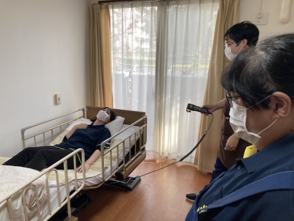 ①4点柵をしたベッドに臥床、半身麻痺の利用者様として麻痺側にコールを操作