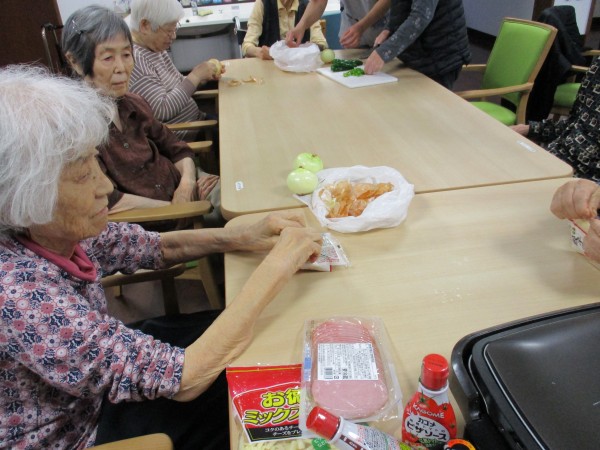 ピーマン・玉ねぎ・ハムを皆さん順番に切ってもらいました。