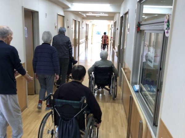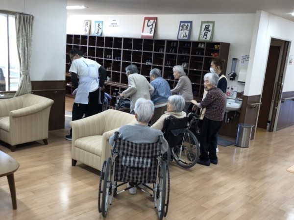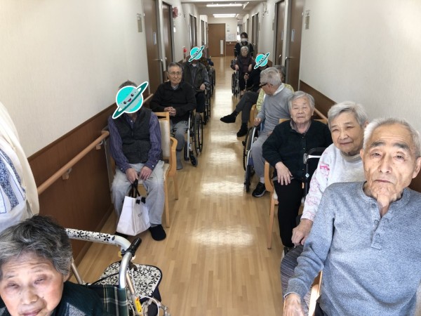 皆様が無事集合したので写真撮りますとお願いしたら、ピースしている入居者の方が・・・思わず笑ってしまいました。