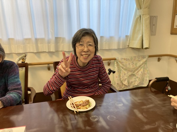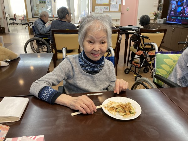 お好み焼きを食べる様子です。ぃぃ笑顔です。