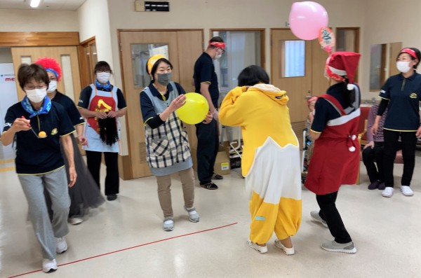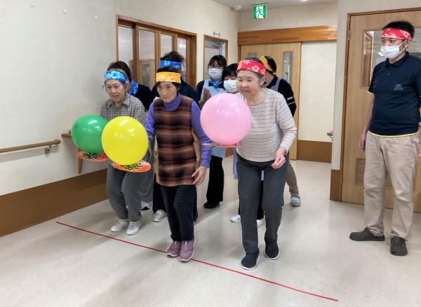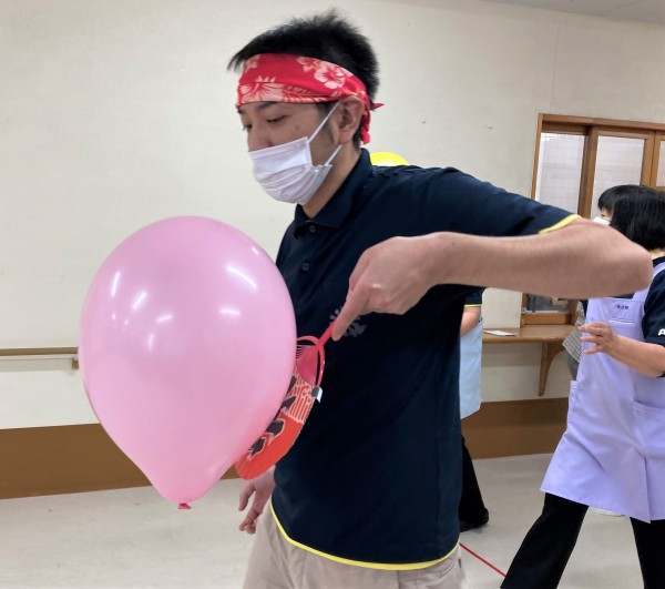 ルールは簡単!風船を団扇で運ぶリレーです♪