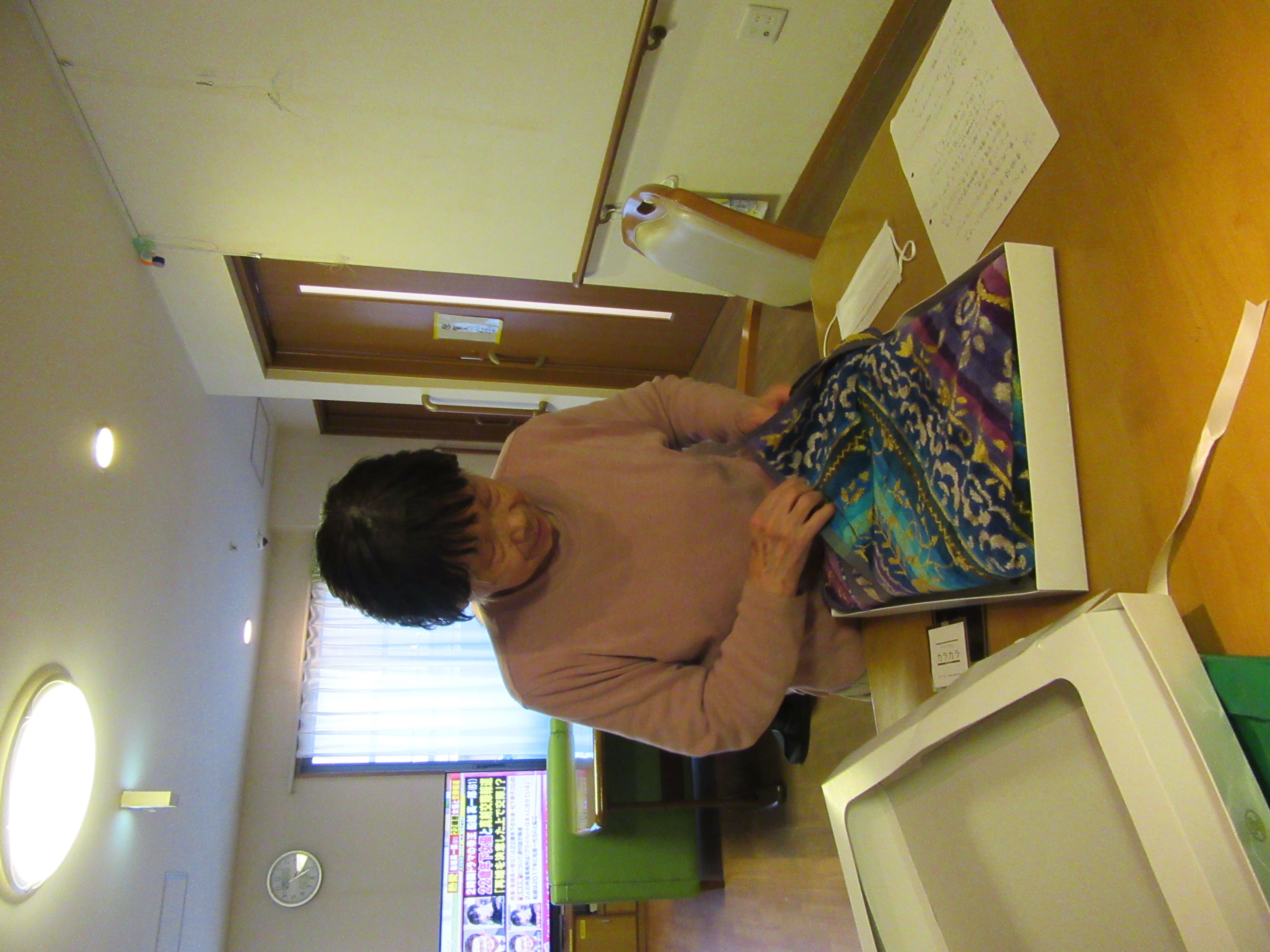ご家族からのプレゼントをお渡しすると「うれしいわ~、何かしら?」・・・中にはなんと大好物の干し芋と素敵なタオルケットが入っていました!干し芋はさっそくおやつに。「これなつかしいわ、おいしわぁ~」と満面の笑顔。素敵なお誕生日になりました。