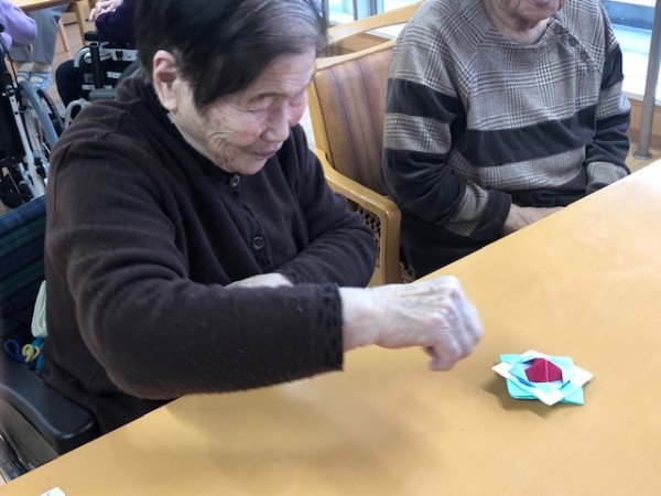次は折り紙3枚で作ったコマまわし!上手に回せるかな?