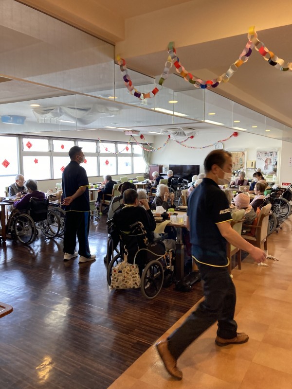 職員さんがお配りし、お手伝いをする方、セッティングをする方、ご自分で召し上がる方、それぞれのご様子に合わせて対応しています!