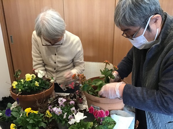 お花は事前に利用者様とスタッフがご近所のお花屋さんにお散歩へ行った時にどのお花で何色がいいか選んできました。
