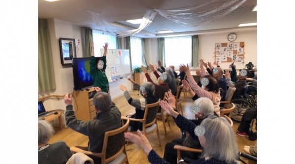 こんにちは。本日は職員がインストラクターになり、音楽に乗せて体操しました(^_-)-☆