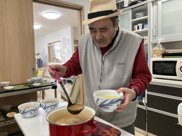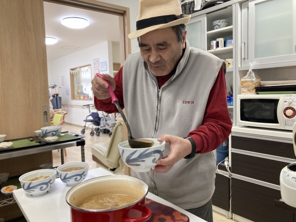 職員が麺を茹で、ご入居者様につゆをそそいで頂きました。