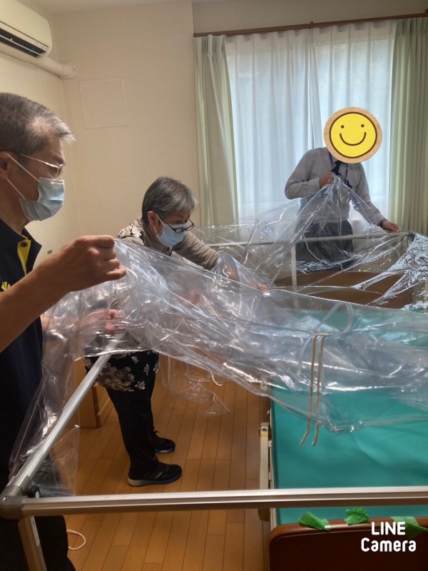 ベットの周りにビニールシートで囲うためのパイプの組み立てをしなければいけないため、居室を使い実際に組み立てました。