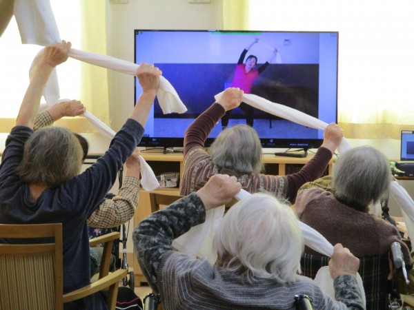 ご利用者の皆様には、一つのフロアに集まっていただき、テレビ越しに映った先生の掛け声に合わせて、タオルを握って手を上げ下げしたり、タオルを投げたり...。