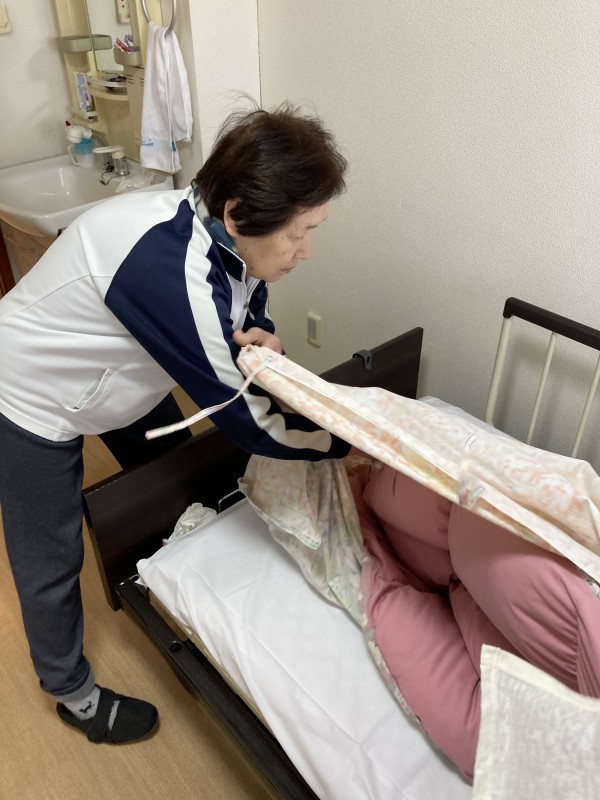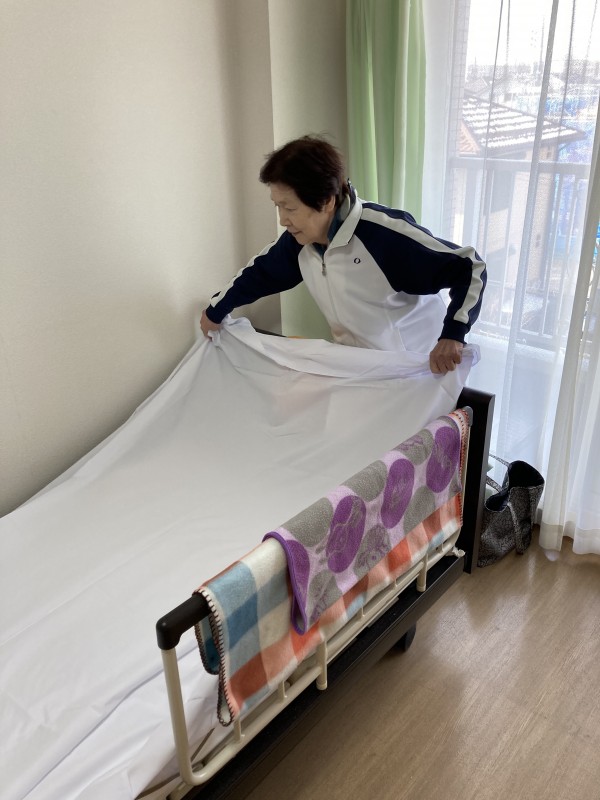 週に一度のシーツ交換日。「この前替えたばっかりだよ」と言うも職員が交換を始めると、「一緒にやりましょう」と、ご自分のカバーを外し始めました。「こうでいいんだっけ?」など職員に確認しながら進めます。新しいシーツを伸ばし、カバーをはめ、きれいになりました。「さっぱりして気持ち良いね!」今夜は気持ちよく眠れそうですね♪