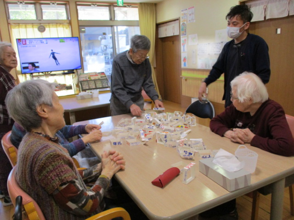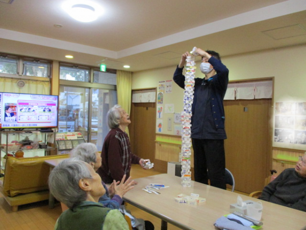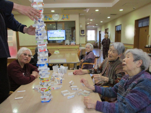 何故かホーム長が「牛乳パックタワー」に挑戦しています(^_-)-☆