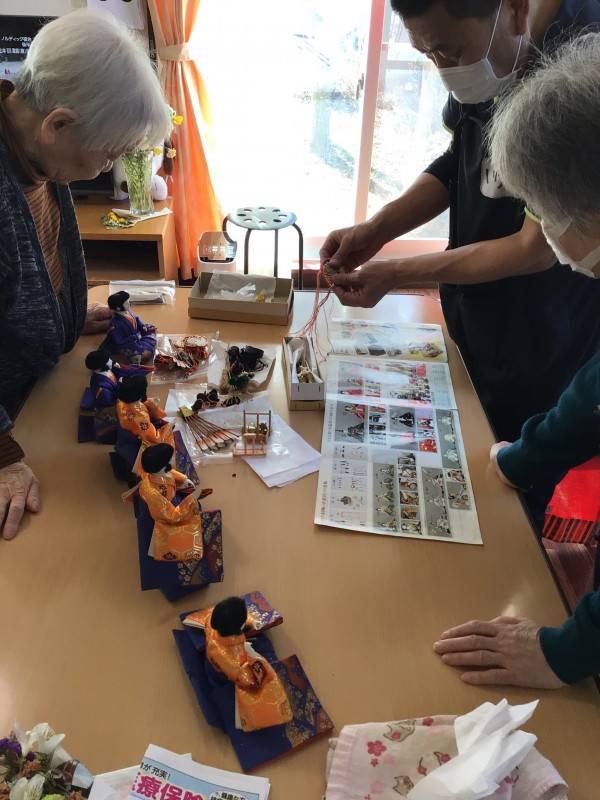 H様、F様の監督のもと、はじめてお雛様を飾る男性スタッフが四苦八苦しながら1時間ほどで完成しました。