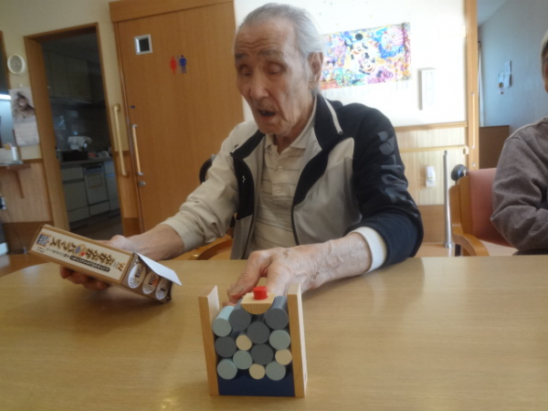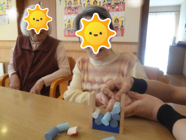 波に見立てた丸い筒状の積み木を指で押して船を下まで運ぶゲームとなります(^^♪