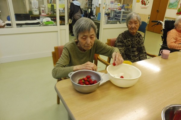 おやつで使用する「いちご」のへたとり。