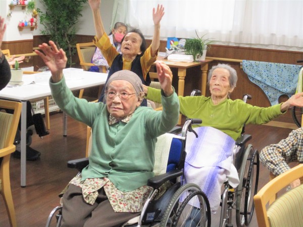 音楽に合わせて声を出して体を動かします。