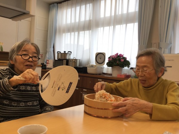 ちらし寿司には欠かせない酢飯をうちわで冷ましている様子。