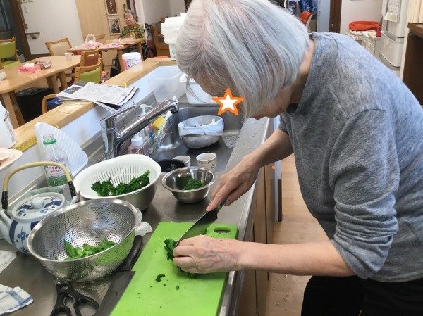 今回は、ちらし作りということで、T様は久しぶりに包丁を使って菜の花を切っている真っ最中でしたが、チラッとカメラ目線。