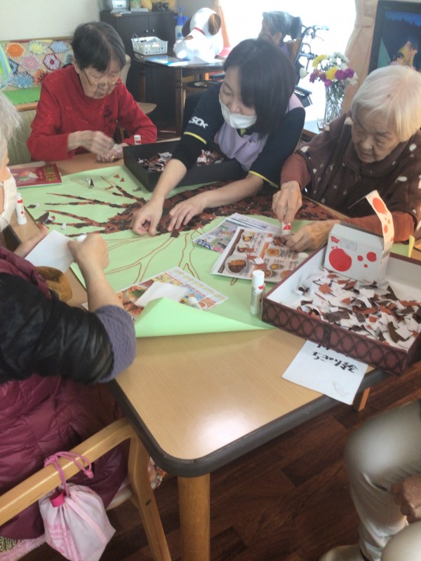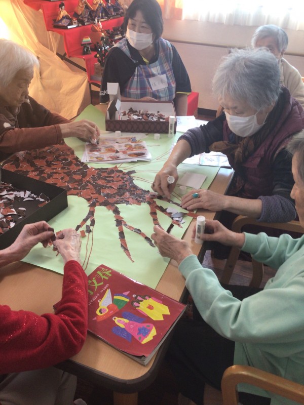 外の梅の木や、花を見ながら、季節の話や後ろに飾られている(当時)ひな壇を眺めて「綺麗だね~」「ちゃんと3日に仕舞わないとお嫁に行けなくなるわよ!」等、会話に花をたくさん咲かせておりました( *´艸`)