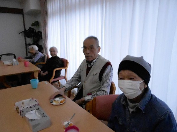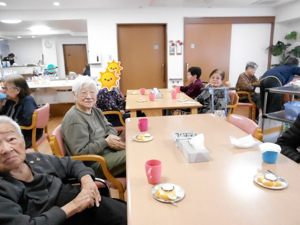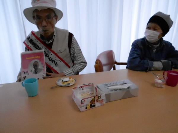 誕生日帽子(?)とタスキを掛け 2階の入居者様に祝っていただきました