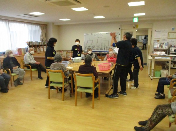 こんにちは!デイサービスセンター遊・西東京です!今日の運動レクリエーションは『リンボーお手玉』です。