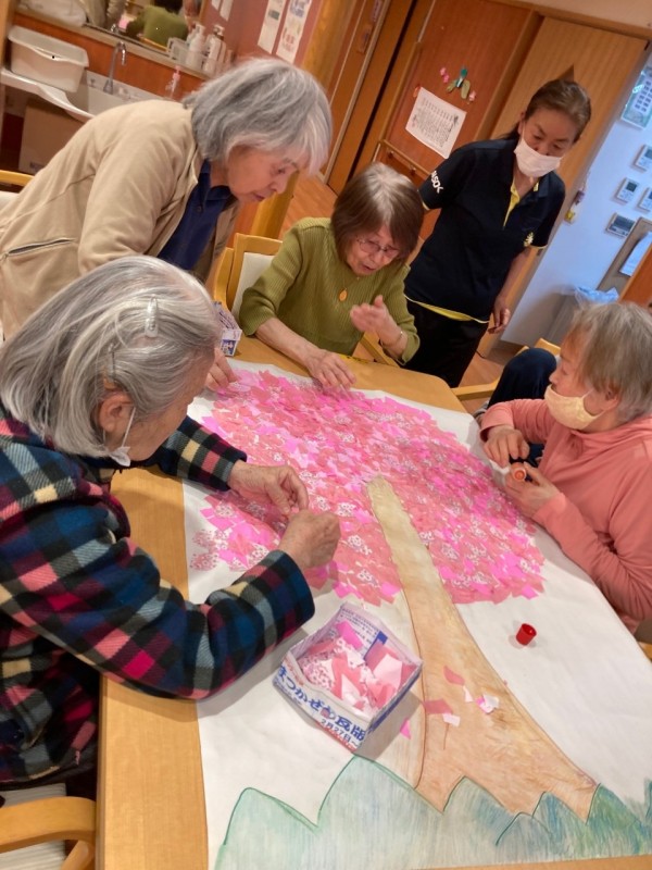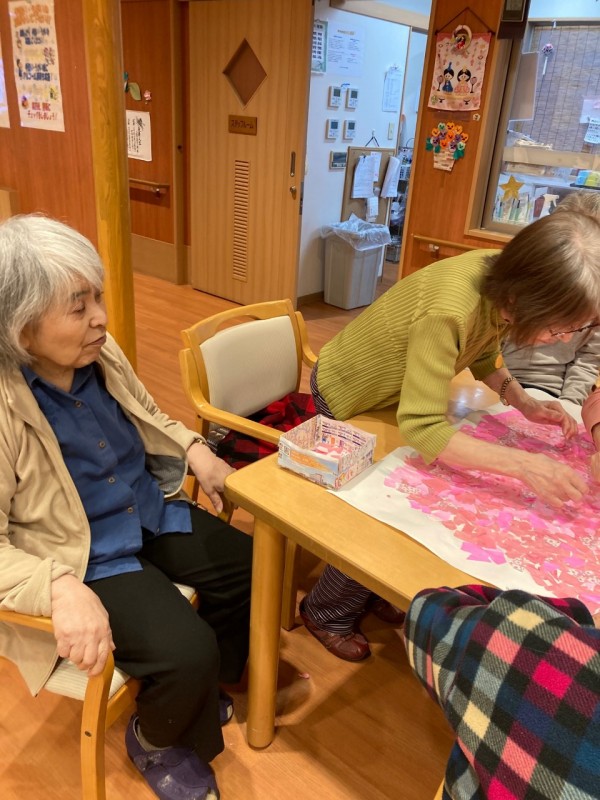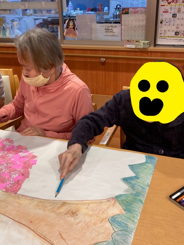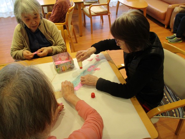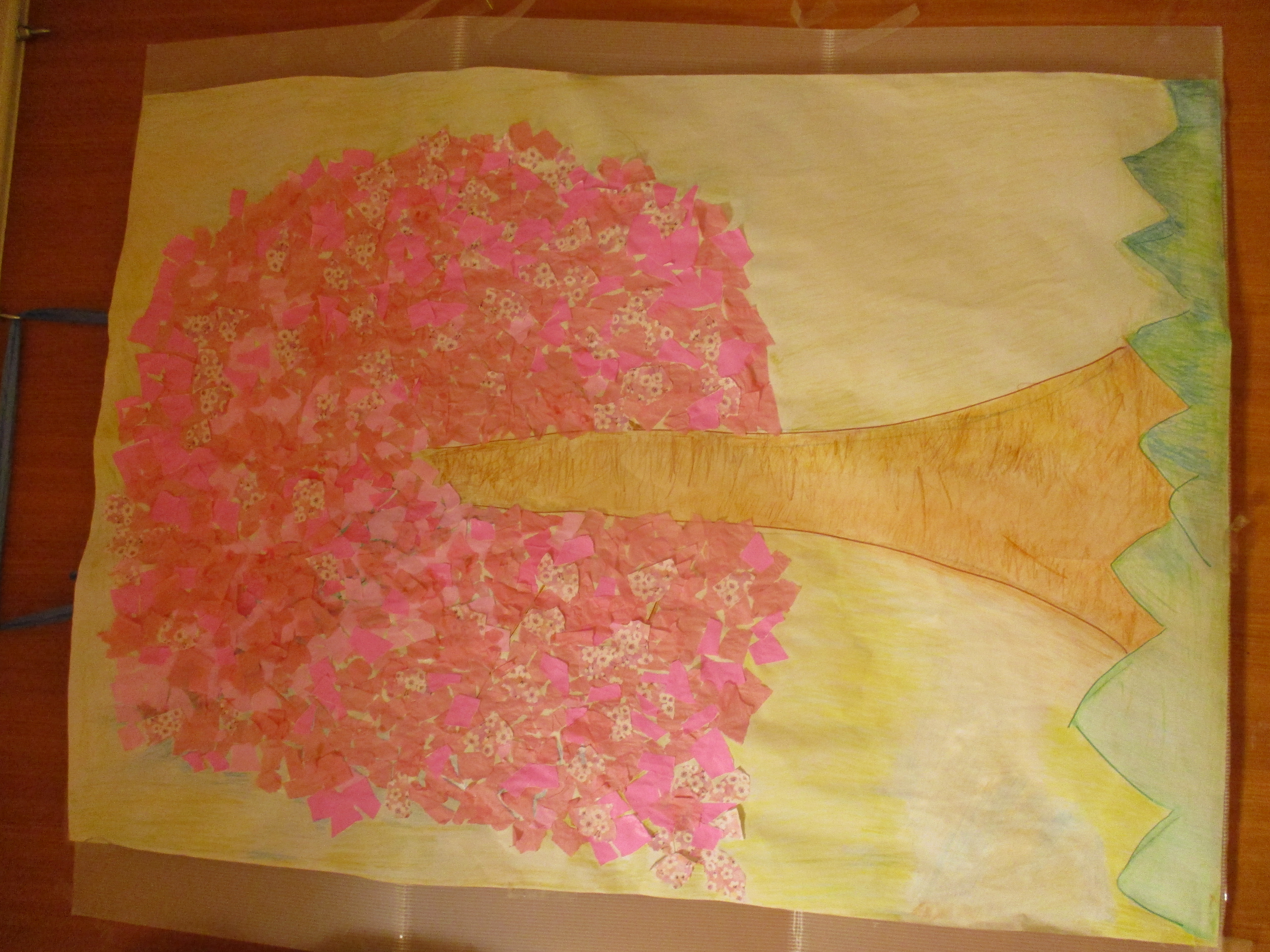 まずは、模造紙に下書きの色を塗り、折り紙を破り貼って行きます。