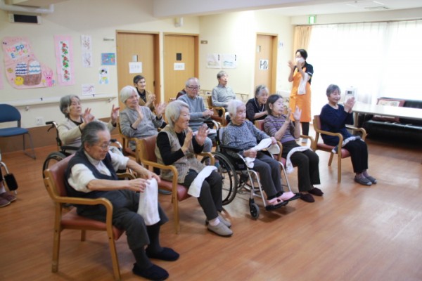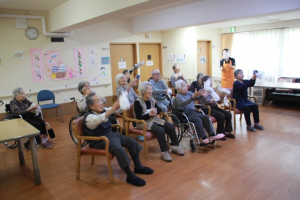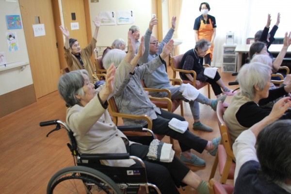 認知症対応型共同生活介護 グループホームみんなの家・蕨です。本日は、AK(あんしん、かんたん)トレーニング【タオル体操】に参加しました。タオル1本で、いろいろな体操ができるので、皆様楽しみにしているAK【あんしん・かんたん】トレーニング【タオル体操】」です。皆様首にタオルをかけ、体をほぐす運動から始め、タオルを肩幅に持ちバンザーイそのまま体を右側に倒しまーす。と言う具合にわかりやすく簡単にストレッチ、後は、タオルを丸めたり、結んだり、膝に引っ掛けて引っ張ったり、絞ったり、握ったり次から次に変化するので楽しく、出来ない事も笑ってごまかして楽しみながら今日も運動しています。