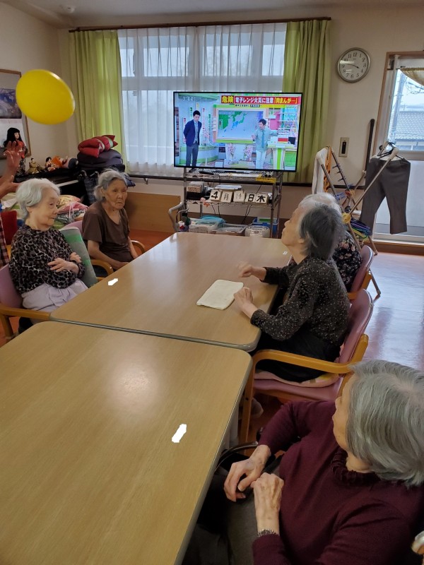ホールで皆さんで風船バレーをして過ごします。なかなか全員参加とはいきませんが、賑やかな雰囲気にいつも目を閉じている方もぱっちり覚醒されていました((+_+))