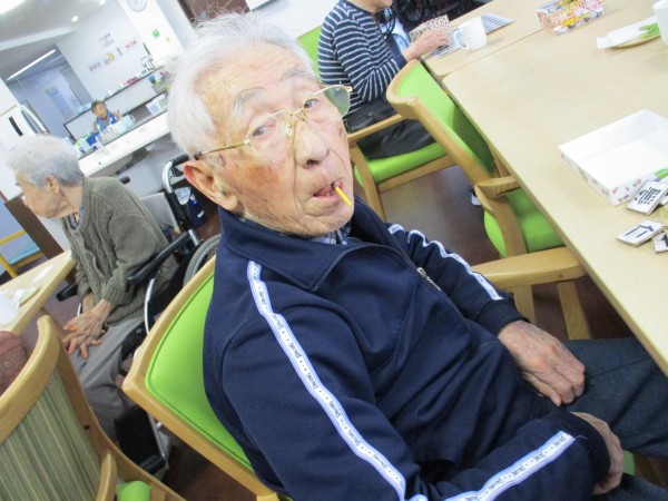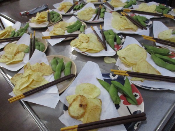 本日のおやつは居酒屋風のおやつとして、枝豆・ポテトチップス・ポッキーにしました。