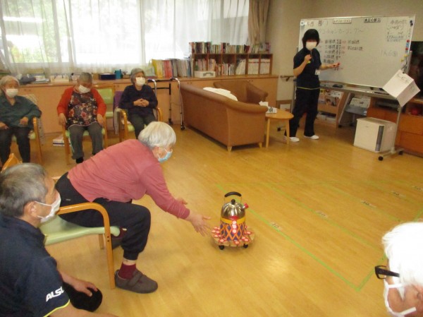 こんにちは!デイサービスセンター遊・西東京です!今日の運動レクレーションは『タコチャンカーリング』です。手作りのタコに似せた『タコチャン』を