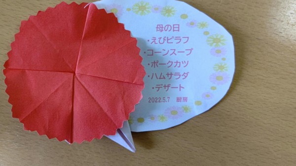 1人1人に折り紙でカーネーション付きメニュー表を作ってくれました(≧▽≦)