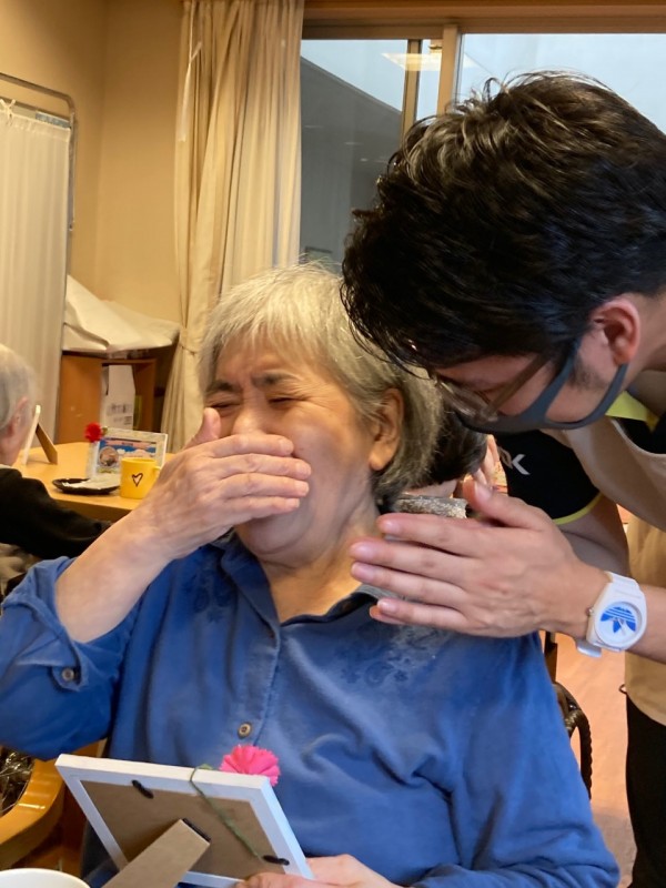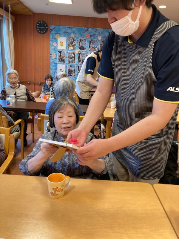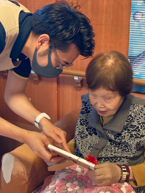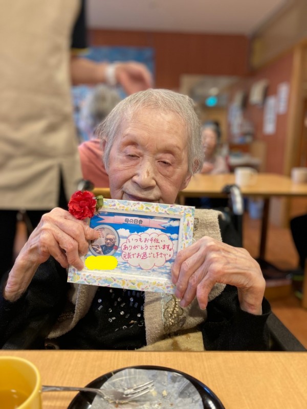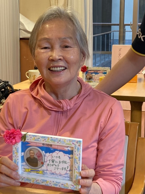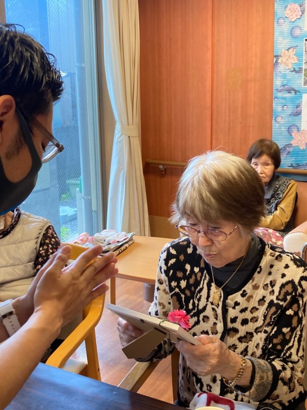 母の日なので、女性入居者様へ、職員による手作りメッセージ入りで「母の日会の写真盾」をプレゼントしました。