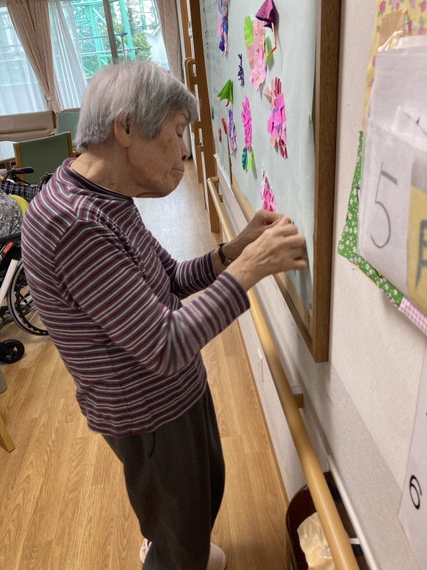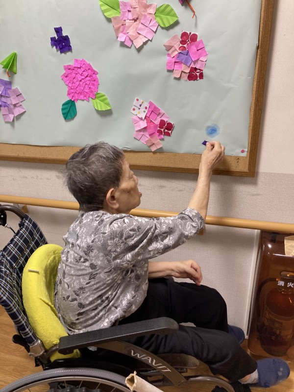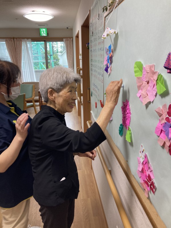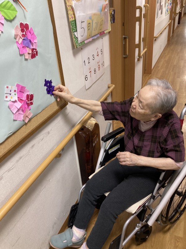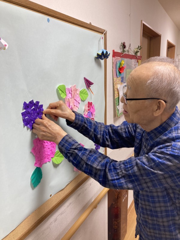 今日はスタッフと一緒に折紙でアジサイを作っています。