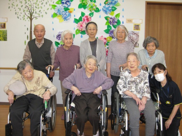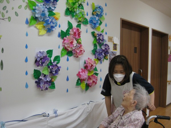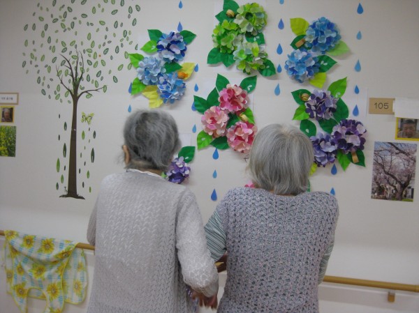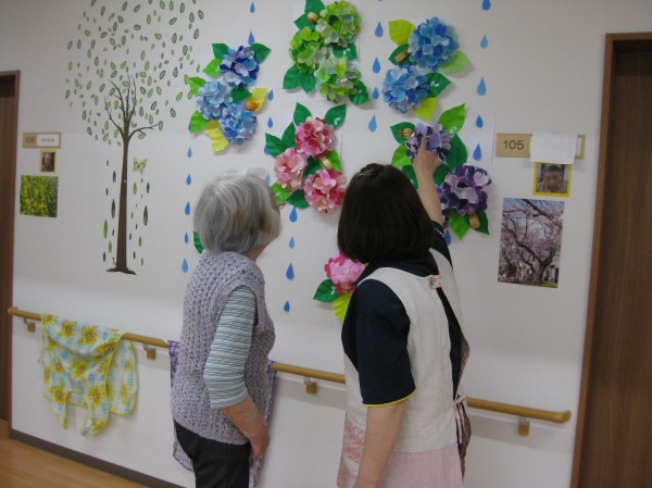 こんにちは!グループホームみんなの家・あきがせの介護ブログです!よろしくお願いいたします。今日はアジサイの花で壁画を作成しました!!