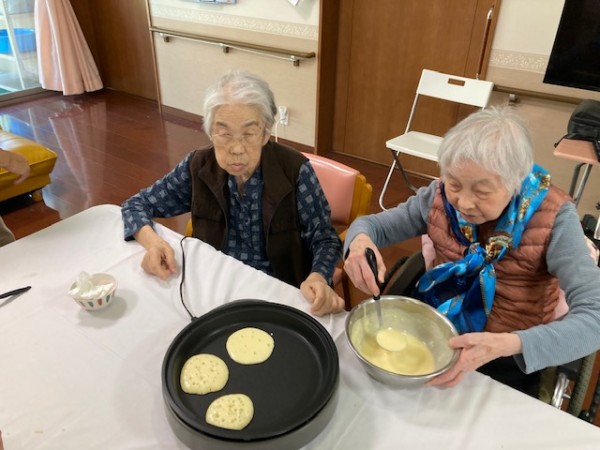 レクリエーションとしてホットケーキミックスを使用してのどら焼きづくりを行いました。