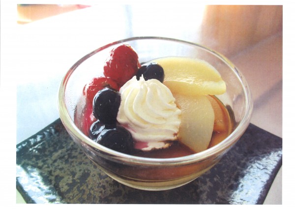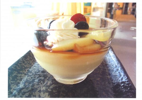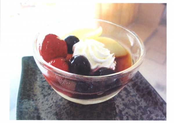 プリンにミックスベリーと白桃、ホイップクリームを