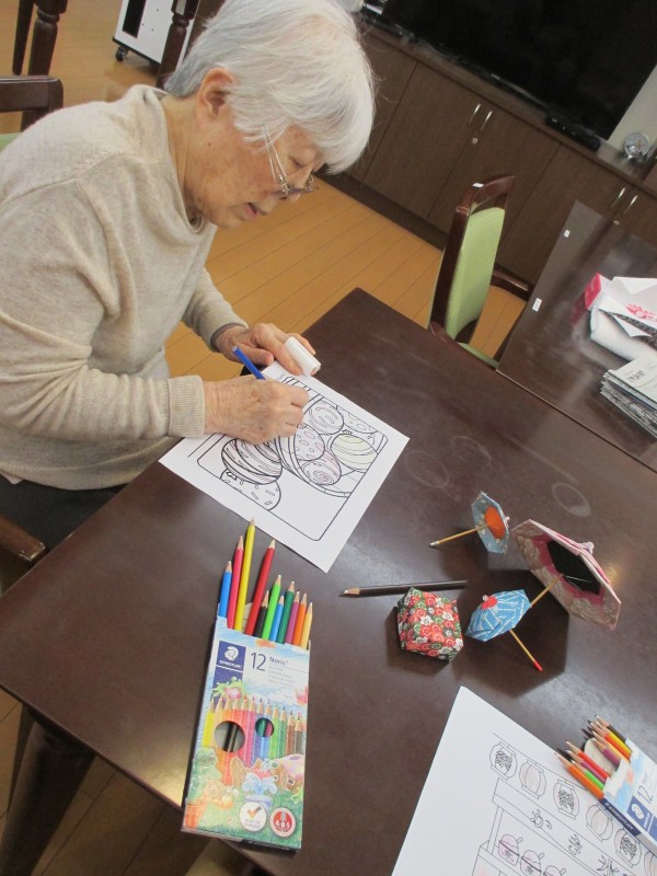 今日は午後に塗り絵を行いました(^_-)-☆ケアマネHさんが中心となって皆さんで行いました。