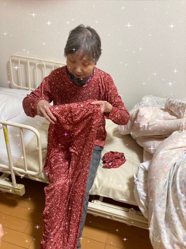 ご家族様に頂いた新しい洋服に着替え、「どう?似合ってる?」