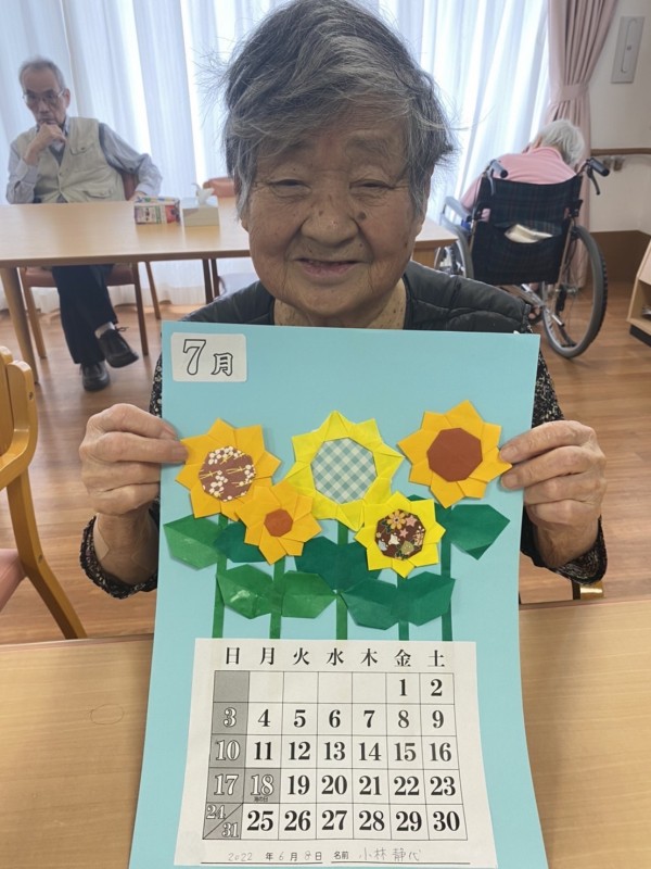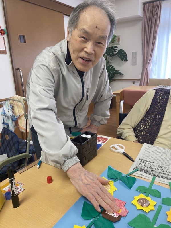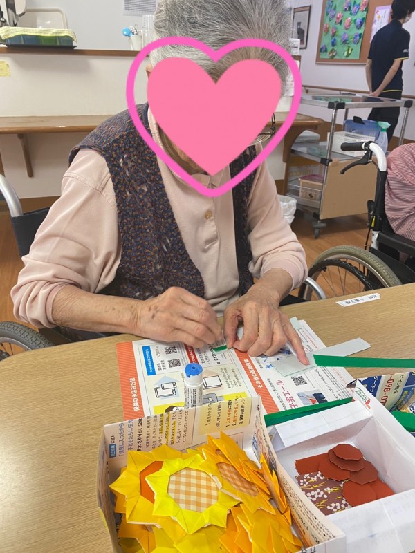 夏らしい『向日葵』などをスタッフと一緒に折り紙で作成し、大きな模造紙にバランスを考えながら貼って頂きました。
