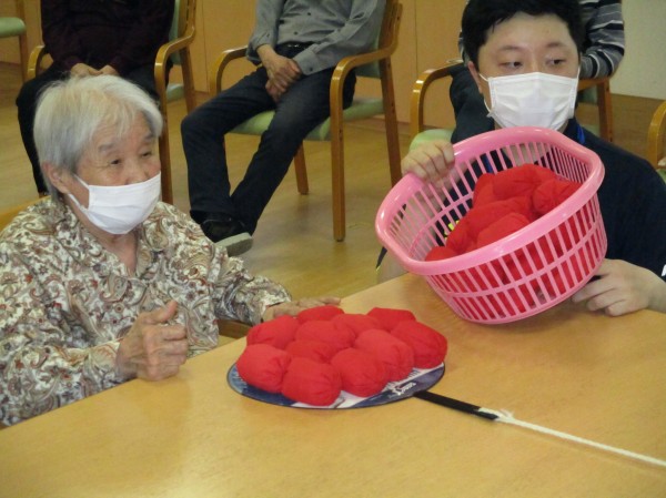こんにちは!デイサービスセンター遊・西東京です。本日の運動レクレーションは『リンボーお手玉』です。