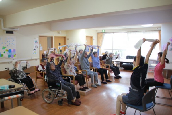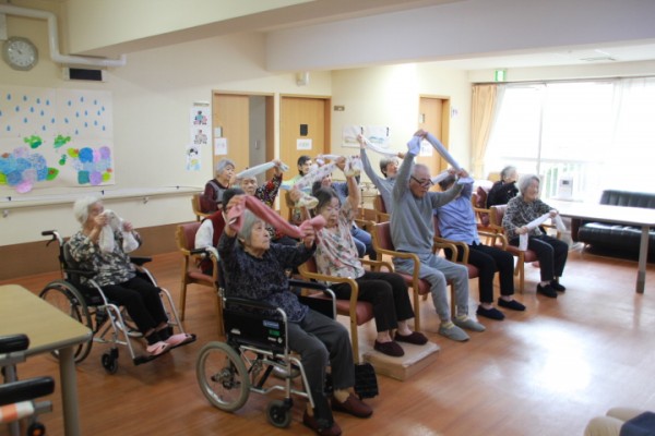????こんにちは!認知症対応型共同生活介護グループホームみんなの家 蕨です。いつも、ご覧いただきましてありがとうございます。梅雨入りし、うっとうしい日々が続きます。ジメジメしている6月10日、高橋指導員がAK(あんぜん・かんたん)トレーニングのタオル体操の指導に来てくれました。パチパチパチパチ!! 本日の参加者は、ご利用者様が、13名 職員3名が参加タオルを使って、ストレッチ運動です。皆様、普段からノーアエクササイズや、いきいきリズム体操でトレーニングをしているので、体がとても柔らかく足もよく上がるご利用者様が居たり、先生のトークも皆様楽しみながらトレーニングをしておりました。トレーニングの締めに「でんでんむし」を唄いながら整理体操をしました。????