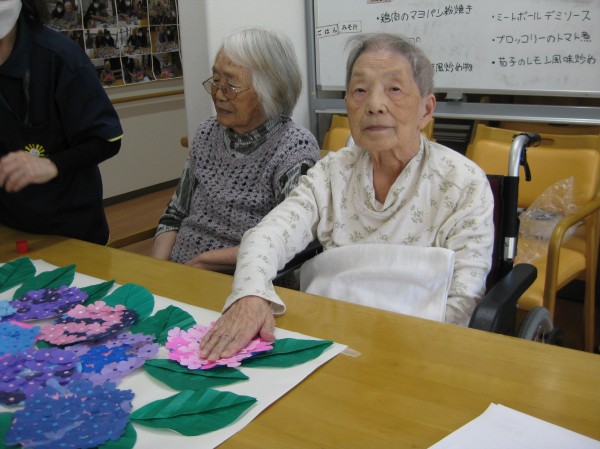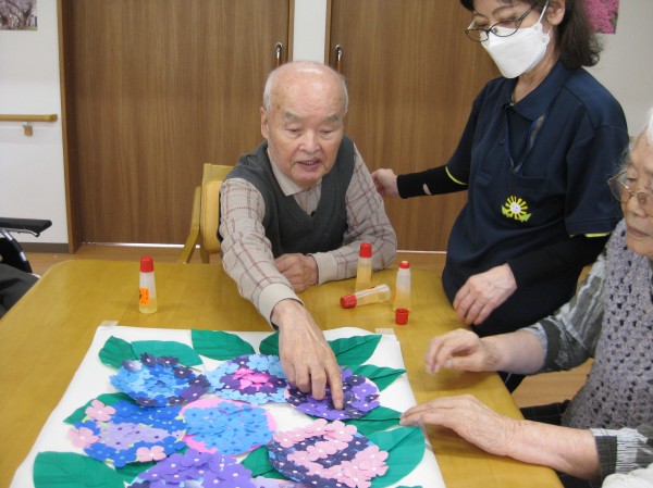 こんにちは!グループホームみんなの家・あきがせの介護ブログです!よろしくお願いいたします。今日は6月お花「あじさいの花」の貼り絵をした時の様子をご紹介します!!