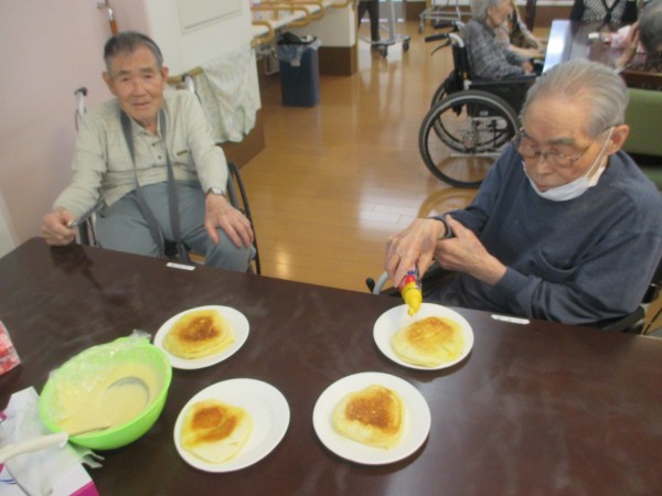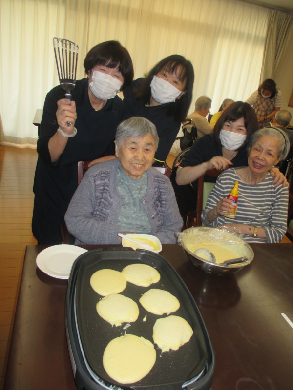 リモート体操が終わった後は、ホットプレートを使ってパンケーキレクを行いました(*^-^*)♡利用者様にお手伝いしてもらいながら☆メープルシロップをかけて♡