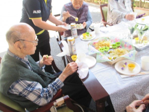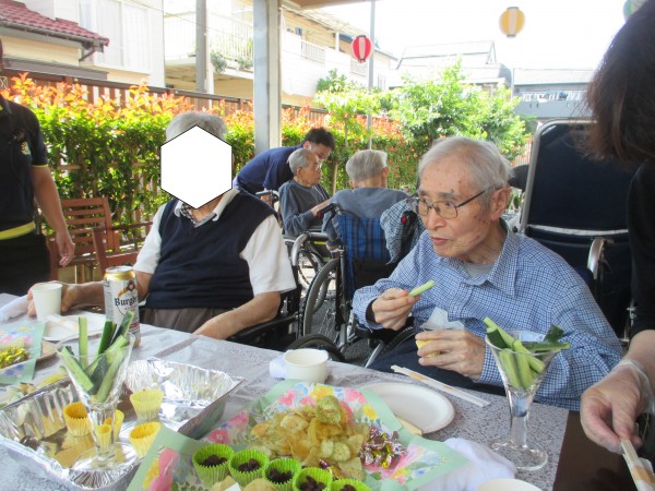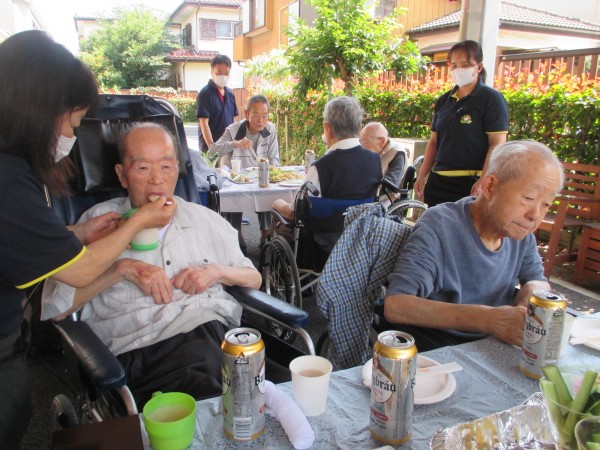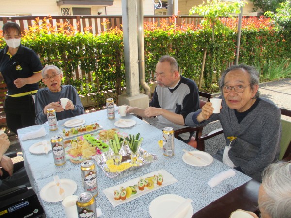 今回は父の日ということで男性のご利用者様に集まってもらい屋外で短い時間ではありますが、ノンアルコールビールとお菓子を皆さんで頂きました(*^-^*)☆