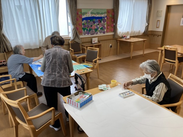 職員で下書きをさせて貰い、その下書きに入所者様に絵具で色を塗って頂きました。