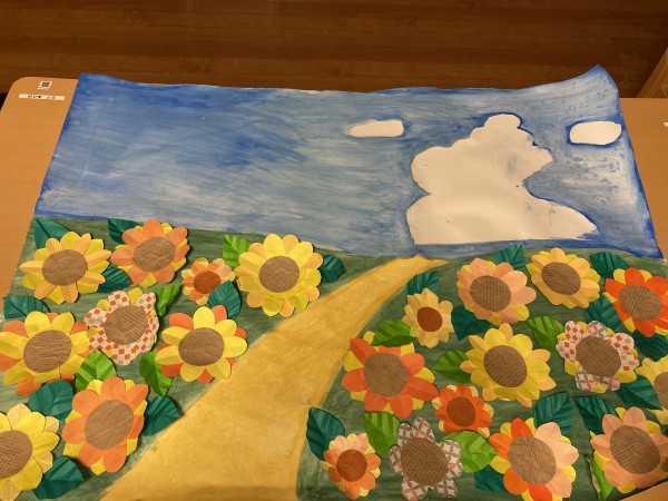 青空の下に元気なひまわり達を咲かす事が出来ました。やっぱり共同作業は完成時の嬉しさはたまらないですね。